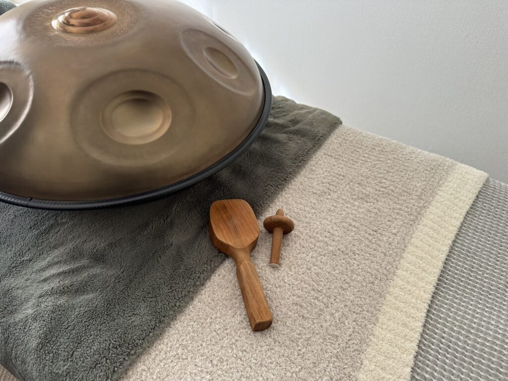 木音mokuneの心地よい振動が体をゆるめ、ハンドパンの倍音が深いリラックスへと導く。